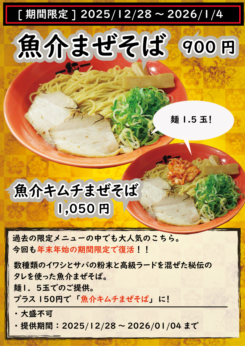 - 5/3~5/6期間限定「魚介まぜそば」復活。